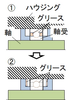 上述した通り、グリースは半固体状をしています。軸受回転前は、軸受内部にグリースが封入されています(下図①)。軸受が回転すると、軌道面のグリースはほとんど無くなり、保持器や軸受近傍のハウジングに付着します(下図②)。