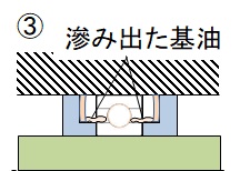 これじゃすぐに潤滑できなくなって壊れてしまうんじゃないかって感じますが、これでいいんです。軌道面は、最小限のグリースがあればいいんです。運転が続くと、保持器や軸受近傍にあるグリースから基油が滲み出てきます(下図③)。この滲み出た基油が軌道面に流れ、適切な油の量で潤滑をしてくれます。