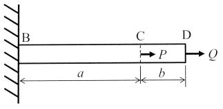 下図に示すように, 長さa+b, 断面積 A,縦弾性係数Eの一様断面な棒がある. その棒は,左端Bで剛体壁に固定されている. 棒のC点及びD点にそれぞれ軸力 P, Q を作用させたとき,棒全体の伸びとして,最も適切なものはどれか。